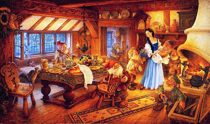 Вечером, после работы в горах, гномы возвращались в свою хижинку, и тогда для них всегда была готова еда.