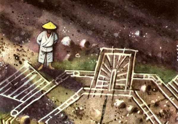 — Ах, не спрашивай, любимая, - пробормотал Ванг-Сяо. - Я должен в течение трех дней построить вокруг дворца высокую стену и выложить ее разноцветными камнями. Если мне это не удастся, то мандарин прикажет отрубить мне голову.