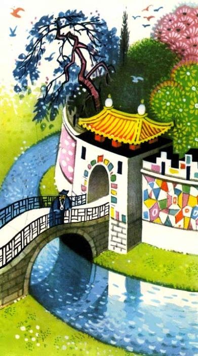 Сама же фея выдернула из волос шпильку и начертила круг вокруг каменной стены у дворца. А в следующее мгновение вокруг стены уже журчала глубокая река с великолепной прозрачной водой. Потом фея взяла в руки бумажные деревья, цветы, птиц и рыб и подула на них. И вот уже птицы поднялись в воздух, деревья заняли свои места в парке, цветы в траве начали издавать аромат, а рыбы заплескались в реке.