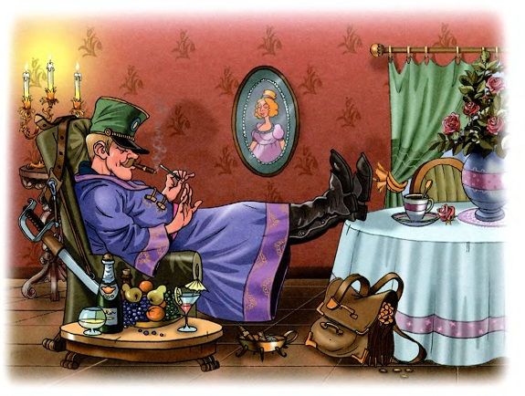 Город был большой и богатый. Солдат пошёл в самую большую гостиницу, нанял себе самые лучшие комнаты и приказал подать все свои любимые кушанья – ведь он теперь был богачом. Слуга, который чистил его сапоги, удивился, что у такого богатого господина такие плохие сапоги, – ведь солдат ещё не успел купить новые. Зато на другой день он купил себе самую красивую одежду, шляпу с пером и сапоги со шпорами.