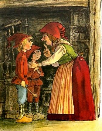 Мать семейства накрывала на стол, а Пулька помешивал кипящее варево в большом котелке над огнем. Он ведь уже большой, скоро одиннадцать лет. Задание это считалось почетным в семье гномов, потому что рождественский ужин был самой торжественной трапезой в году.