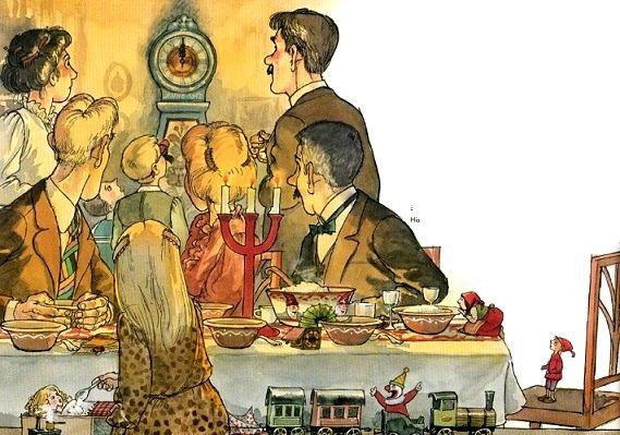 Они отлично знали, как проникнуть в дом и забраться на высокий шкаф в зале так, чтобы их никто не заметил. В доме было полно тайных дверей и переходов, известных только гномам и мышам. Рассевшись на шкафу, они стали смотреть на людей за праздничным столом.