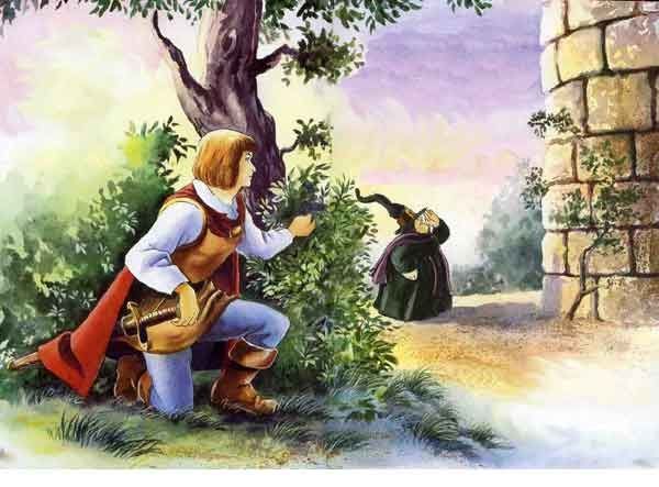Однажды принц услышал шаги и спрятался. Из своего укрытия он увидел колдунью. Она звала: