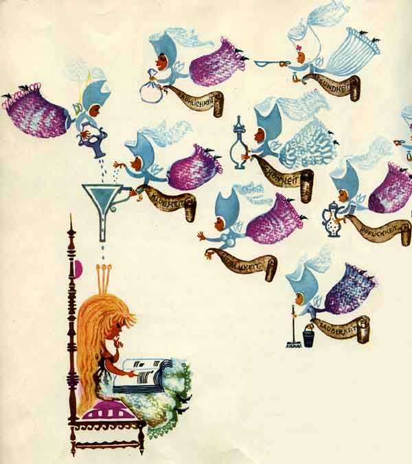 "Я пряду" - сказала старушка и наклонила голову. "Что это за работу, которую ты выполняешь с такой радостью?" - спросила девочка. Она взяла веретено и хотела попробовать прясть.